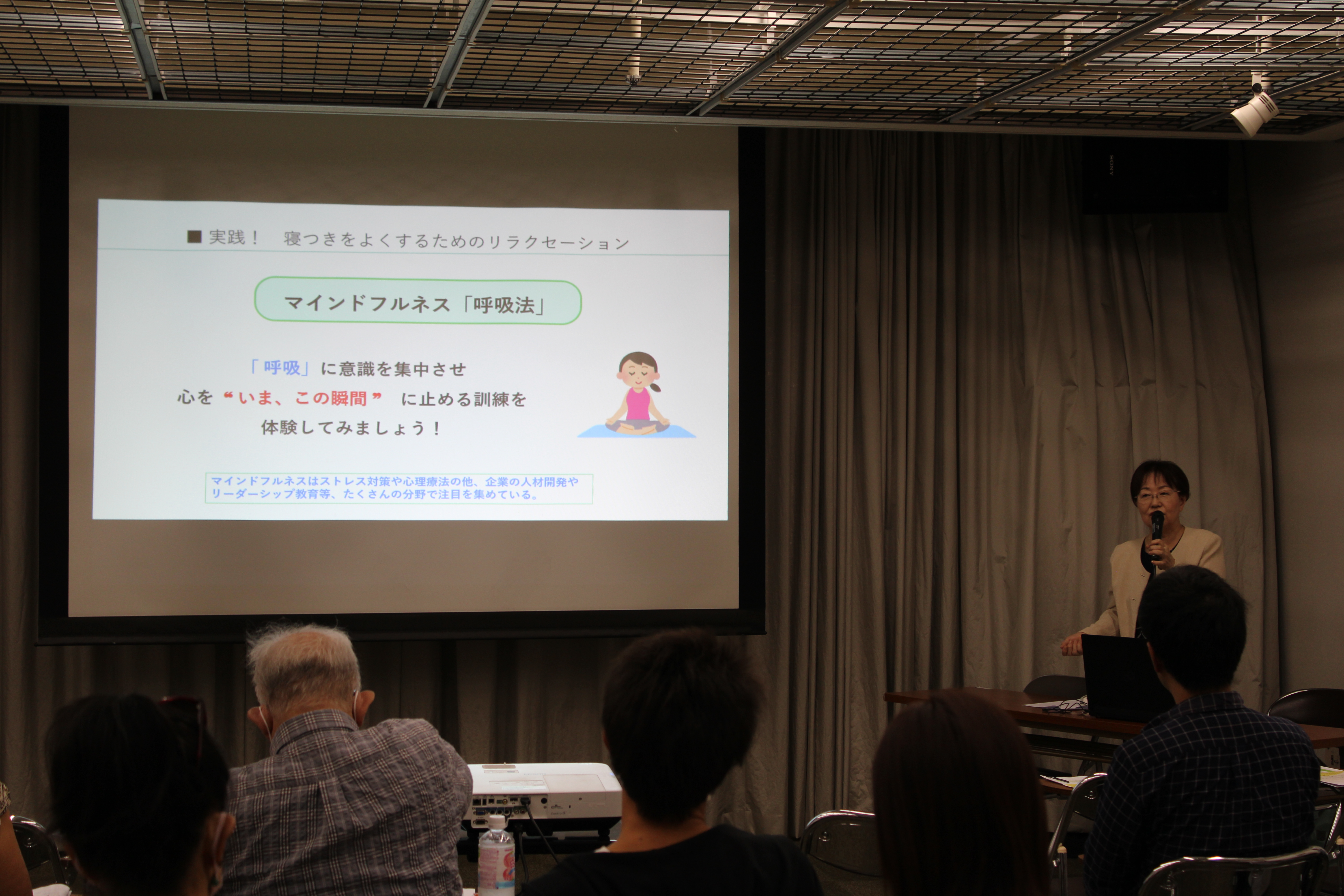内容は「睡眠にはストレスが深く関係していること」、「熟睡するために必要なこと」、「心身が穏やかで、元気に生き生きライフ」として、「リラクセーション~マインドフルネスの呼吸法」をお伝えしました。
